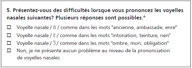 Comme pour les semi-voyelles, ce problème de prononciation s'ajoute à un problème de reconnaissance graphique. Comme le révèle le questionnaire, si les étudiants ont conscience de ces difficultés, leurs réponses mettent en évidence que le phonème [ɛ̃ ] leur poserait plus de difficultés que le phonème [ɑ̃ ] et [ɔ̃ ]. Ceci pourrait être dû aux diverses graphies possibles du son [ɛ̃ ]: “in”, “im”, “ein”, “ain”, “yn”, “ym”, “un”, “um” et “en”.
