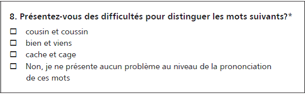 Ce questionnaire est composé de 14 questions, majoritairement fermées ou à choix multiples, qui se basent sur notre expérience en tant qu'enseignants de Français Langue Étrangère, FLE, avec ce type de public. Ces questions reposent donc sur des hypothèses que nous avons émises en ce qui concerne les erreurs fossilisables que peuvent commettre ces étudiants en phonétique et phonologie du français. Ci-dessous, les figures 1 et 2 présentent quelques extraits du questionnaire.