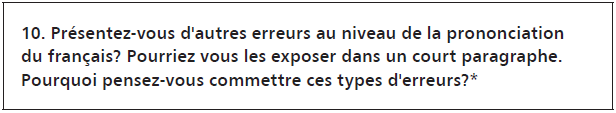 1. Quelles erreurs persistent chez les étudiants des niveaux 5 et 6 de la LLM en ce qui concerne la phonétique et phonologie du français? Nous entendons par là, les erreurs dites persistantes, systématisées ou bien encore fossilisables, que les étudiants commettent mais qui correspondent peut-être à un niveau antérieur d'apprentissage.