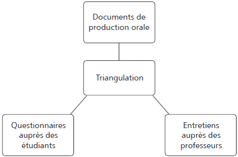 Nous rendrons compte des trois instruments utilisés dans le cadre de cette étude, c'est à dire du questionnaire que nous avons réalisé auprès des étudiants des derniers niveaux de français, des entretiens que nous avons menés auprès de leurs professeurs et finalement, de l'analyse des productions orales des étudiants concernés.