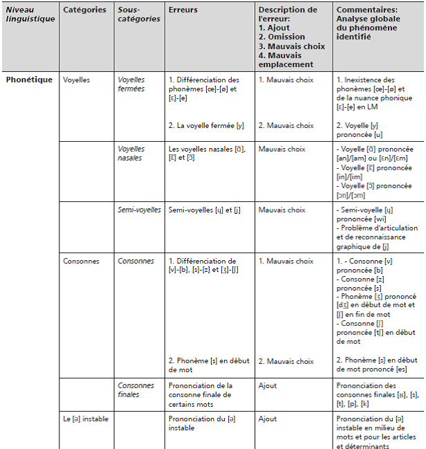 Une fois toutes les erreurs identifiées, nous nous sommes basés sur la classification proposée par Angélica Alexopoulou (2005) et nous avons retenu, plus spécifiquement, deux types de critères. Le premier critère retenu est le critère linguistique de l'erreur qui, dans notre cas, correspond au niveau phonétique et phonologique de la langue. Pour ces deux niveaux, nous avons établi les catégories et sous-catégories suivantes: