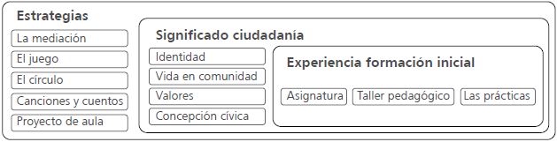 En esta categoría, las futuras educadoras hacen referencia a los elementos que tributan a la educación ciudadana, entre ellas la asignatura: “Lo que recuerdo es que nos hicieron un curso donde tenía que ver eso. Nos pasaron de lo que se trataba más o menos, esa vez nos dieron estrategias para trabajar con los niños” (Educadora en formación 3). No obstante lo anterior, en otras educadoras en práctica la asignatura no estuvo presente en su itinerario formativo: “No recuerdo que haya habido un ramo específico, como que tuviera el nombre de ciudadanía o formación ciudadana, no” (Educadora en formación 1).