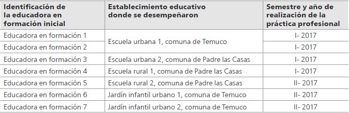 El estudio comprendió una indagación con siete educadoras en formación inicial. Los criterios de selección fueron: haber realizado la práctica profesional durante el año 2017, haber tenido esta experiencia formativa en algunos de los jardines infantiles rurales y/o urbanos dependientes del Estado y que los jardines en que se realizaron esas prácticas profesionales estuvieran ubicados en algunas de las comunas de la región de La Araucanía, Chile.