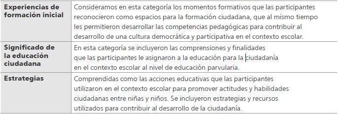 Esta categoría hace referencia a las apreciaciones que las educadoras en el estudio le otorgaron al significado de la educación ciudadana. Sobre el particular, las opiniones se agrupan, por un lado, bajo el tema de importancia para el desarrollo de la identidad, que puede ser refrendada en declaraciones como: “Es una parte de la identidad de los niños, es algo que tienen que aprender para cuando ya sean adultos y que la idea es que se vaya interiorizando desde pequeños” (Educadora en formación 3). Por otro lado, las opiniones se relacionan con algunos valores clave para vivir en sociedad, como se desprende de la siguiente afirmación: “Yo creo que serían niños mucho más responsables, mucho más conscientes de su rol dentro de la sociedad, de niños que trabajen de forma pacífica, niños más respetuosos, yo creo que por ahí va la cosa” (Educadora en formación 1).
