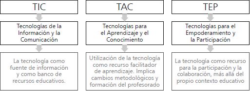 Adell (2008) señala que existen varias fases en la adaptación del profesorado para conseguir un uso de la tecnología aplicado a la innovación educativa, que se asemejan a los resultados obtenidos por Brijaldo- Rodríguez & Sabolgal-Modera (2015) en su estudio sobre el uso que se le da a las TIC como apoyo a la docencia. Estas fases van desde un uso básico (tecnología como medio para acceder a información o recursos), pasando por un uso instrumental (tecnología como medio para hacer las mismas tareas de la misma forma que se hacían anteriormente, pero con ordenadores) hasta un uso tradicional (integración de las TIC en prácticas educativas tradicionales). En las etapas superiores se encuentran la apropiación, que hace referencia a los profesores que usan las TIC como un medio para experimentar nuevas maneras de trabajar didácticamente, y la innovación, en la que se encuentran docentes capaces de utilizar la tecnología educativa desde una perspectiva crítica, creativa e interdisciplinar.