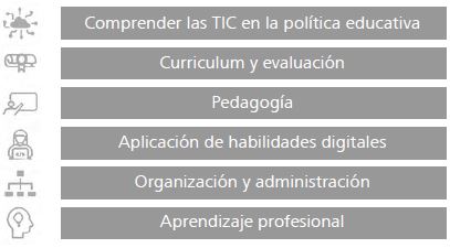 Este marco (figura 2) muestra un modelo de competencia digital genérico para docentes (Cabero-Almenara et al., 2020), cuyas cinco áreas y 21 subcompetencias son comunes a las del Marco DigComp. Por otro lado, el marco de la UNESCO (Butcher, 2019) presenta áreas centradas en el uso didáctico de las TIC en la práctica docente (figura 3), lo que se traduce en áreas vinculadas a mostrar el potencial de las TIC como herramientas educativas.