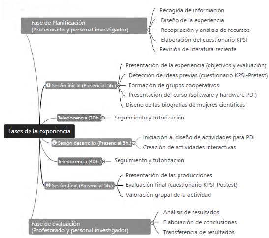La investigación se estructuró en tres etapas: la primera supuso la medición inicial de la variable dependiente (pretest); en la segunda se desarrolló el programa formativo (intervención), y en la tercera se repitió la aplicación de la prueba de evaluación (postest). La intervención se desarrolló en tres sesiones de trabajo de tipo presencial (15 horas) y sesiones de trabajo virtual (60 horas) a través del portal de teledocencia EduPonte (https://eduponte.cesga.es/indexlogin.php). La primera sesión fue de introducción al uso de la PDI, y en las siguientes sesiones (presenciales y virtuales) los estudiantes empezaron a crear el contenido. En la última sesión se presentaron los trabajos en el aula, tal y como se resume en la figura 4.