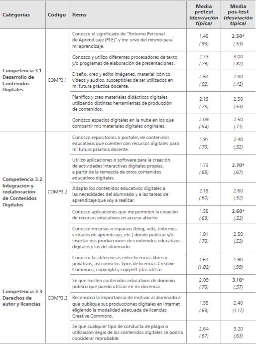 Los resultados del KPSI inicial (pretest) han permitido identificar necesidades de formación en competencia digital docente en el área de creación de contenido para el profesorado que se encuentra en proceso de formación didáctico-científica; los resultados coinciden con la investigación realizada por Castiñeira et al. (en presa) y Gabarda et al. (2017), pues se trata de un área poco investigada, en la que los profesores consideran no tener buen nivel de formación y que, por lo tanto, repercute en su desempeño profesional (Gutiérrez & Serrano, 2016; Rodríguez et al., 2019; Pozo et al., 2020).