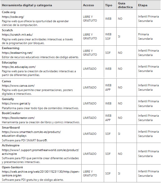 Estas categorías han permitido analizar las posibilidades y potencialidades didácticas de un total de 10 herramientas digitales, todas ellas vinculadas a la creación de contenido digital. En la muestra se incluyen herramientas que admiten la creación de actividades interactivas, material gráfico y visual, cuentos interactivos, programación y softwares de PDI.