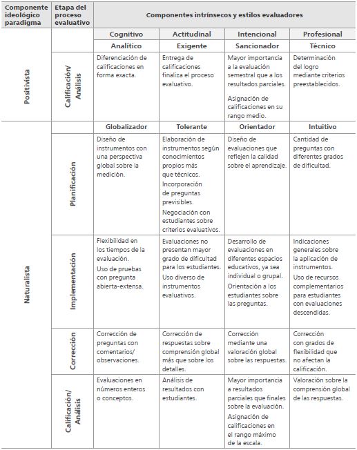 Si bien existen otras perspectivas teóricas (Chong, 2018; Serafini, 2000) y modelos explicativos reportados en los estudios empíricos (Remesal, 2011; DeLuca et al., 2013; Xu & Brown, 2016) acerca de paradigmas, concepciones y prácticas evaluativas, la propuesta de Ahumada (2003) es sustancial, pues ofrece una distinción analítica que introduce estilos evaluadores de los docentes según las dimensiones cognitivas y subjetivas. Esto permite establecer la relación con los paradigmas positivista y naturalista de la evaluación, así como también describir y problematizar la naturaleza del conocimiento y el significado de la evaluación, además de los criterios evaluativos del . para el aprendizaje y la forma como inciden estos marcos en la enseñanza (Serafini, 2000).