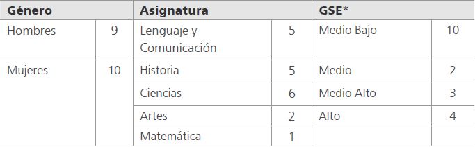 En el estudio participaron 19 profesores principiantes de Educación Secundaria de un establecimiento escolar de Santiago de Chile. Para seleccionar la muestra, se contactaron estudiantes de pedagogía de último semestre durante el año 2016. Se consideraron las nóminas de cuatro programas de formación pedagógica universitaria de Santiago de Chile. Se invitó a todos los estudiantes a participar en la investigación, indicando los requerimientos del estudio. En total, se inscribieron 50 docentes interesados y se seleccionaron 19; la selección se realizó en forma aleatoria, considerando los siguientes criterios de inclusión: el género, la asignatura que enseñan y el grupo socioeconómico (GSE) de los establecimientos en los que estos se desempeñaban en ese momento, de acuerdo a la clasificación de SIMCE de II E.M (Ministerio de Educación de Chile, 2016). De esta manera, los criterios de inclusión buscaron amplitud y diversidad en la muestra, considerando distintos aspectos que pueden modular la relación que el docente establece con sus estudiantes, como es el género, el contenido que enseña (asignatura) y el capital cultural del alumnado (GSE del establecimiento). Dado el número de participantes, no se espera reportar generalizaciones.