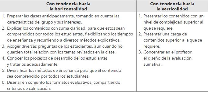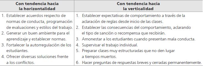 Para cada categoría de las estrategias identificadas se pudo constatar la presencia del énfasis de control docente (señalado como vertical), y del énfasis intermedio, que permite relaciones democráticas (señalado como horizontal). Sin embargo, no se observaron casos con el enfoque del otro extremo, es decir, el que promueve una relación de autonomía de los estudiantes.