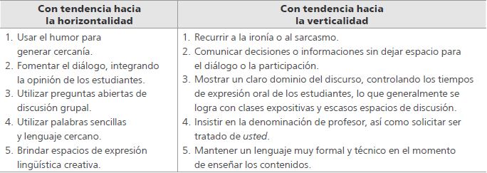 Si bien la comunicación está presente en las categorías anteriores, se identifica un conjunto de estrategias en las que se hace énfasis en la comunicación verbal. Estas estrategias se utilizan en relaciones de tipo horizontal, por ejemplo, en el uso de un lenguaje comprensible para los estudiantes, con espacios de participación comunicativa, de manera que estos puedan intervenir en los distintos procesos de enseñanza y de aprendizaje: “En el fondo es cambiar un poco la idea que uno tiene de la clase expositiva. Quebrar eso un poco y darle un poquito más de autonomía a los niños” (Entrevista n. º 1, profesor 2, Lenguaje y Comunicación, GSE Medio). También incluye el uso de herramientas comunicativas para reforzar la verticalidad, como la imposición de ciertos modos de tratamiento (“profesor” o “usted”), o mostrar dominio y control respecto de los tiempos destinados para hablar: