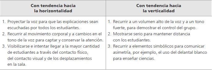 Corresponden a aquellos recursos vinculados con el volumen y tono de voz, el contacto físico y visual, los desplazamientos al interior de la sala y la expresión facial, entre otros. Abarca todos aquellos recursos relacionados con la disposición del cuerpo para lograr establecerse como autoridad en el aula. Encontramos casi tanta recurrencia en estrategias del tipo horizontal como vertical. En el primero, se orientan a visibilizar la presencia del docente al inicio de la clase, captar y mantener la atención durante la clase, así como de intentar llegar a todos para facilitar el acceso a los conocimientos. Cuando son del tipo vertical, buscan mantener una distancia a través, por ejemplo, de una expresión seria, un volumen de la voz alto y el uso de atuendos simbólicos que distinguen al profesor por sobre los estudiantes: “Yo hablo fuerte, pido silencio, soy súper, esto sí es, es importante que yo soy muy pesada para hablar” (Entrevista n.º 2, profesor 8, Biología, GSE Medio Alto).