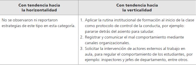 Es la de menor frecuencia de aparición para los casos analizados. Son estrategias instaladas por las organizaciones educativas donde los profesores se desenvuelven. Por ejemplo, el uso del libro de clases, las rutinas organizacionales de inicio y cierre de clases, y la intervención de ciertos actores de la comunidad como inspectores o directivos. Se encuentra una tendencia hacia la jerarquía dentro de esta categoría.