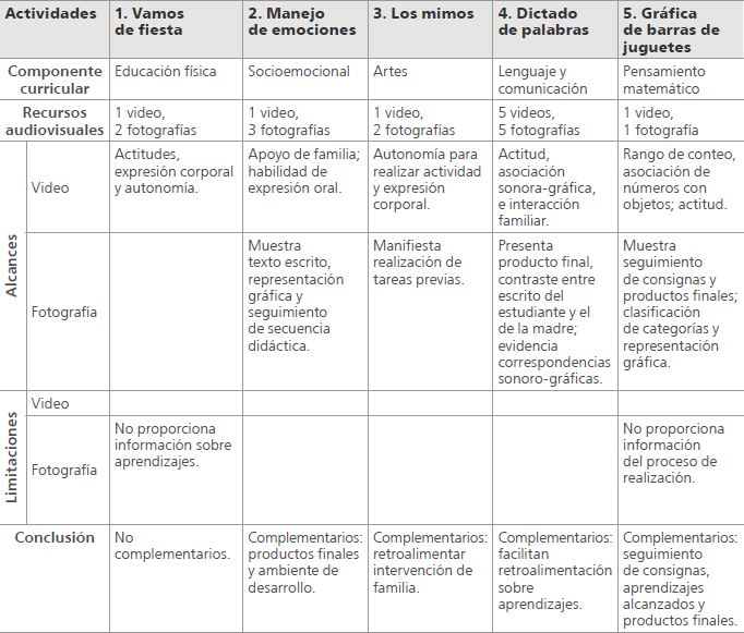 El análisis de las evidencias mostró que en las actividades relacionadas con educación socioemocional, artes, lenguaje y comunicación, y pensamiento matemático, las videograbaciones y fotografías proporcionadas por los padres de familia proveyeron información complementaria para evaluar el cumplimiento del propósito de la consigna (ver tabla 1).