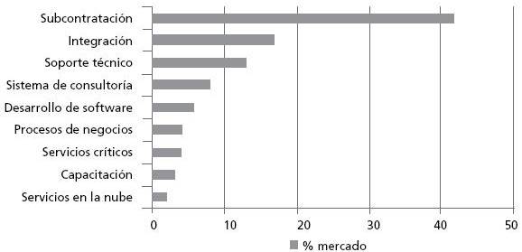 Para el año de 2014 la subcontratación constituye el 42% del mercado de los servicios de IT. La subcontratación puede incluir operación del centro de datos y aplicaciones, monitoreo y gestión remota de sistemas. La producción de páginas electrónicas, análisis de bases de datos, pruebas y servicios de mercadotecnia son otras actividades que se pueden subcontratar. Finalmente, los servicios de colocación de fuerza de trabajo han adquirido creciente importancia entre las grandes empresas de software, aunque esta actividad es la de menor valor agregado. Le siguen en importancia otros servicios de ti como integración, soporte técnico y desarrollo de software. La distribución de servicios de TI puede observarse en la gráfica 1.