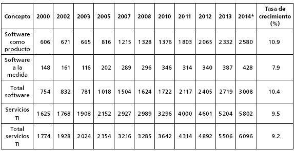 Los ingresos por concepto de productos de software personalizado han crecido a un promedio anual de 8% entre 2000 y 2014, al pasar de USD 148 millones a USD 428 millones, como se ilustra en el cuadro 1. En 2004, cuando se hizo el primer desembolso de los fondos del Prosoft,3 la tasa de crecimiento anual fue superior al promedio del resto de la economía, con 12.05% en el caso del software personalizado y 12% en el del empaquetado. La participación del software en el total de servicios de TI creció de 43% a 50%.