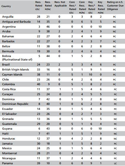 In the case of Panama, this is the result of an agreed working plan to leave the gray list of non-compliant countries. When viewed together, compliance with Recommendations 5 and 23, serve as central pillars of a country's financial system and strategy to combat money laundering and the financing of terrorism. Here the Caribbean nations faced serious issues in fulfilling the FATF regulations, with Aruba, Bermuda, Dominica, Haiti, St. Lucia, St. Vincent and the Grenadines, Suriname, Trinidad and Tobago, as well as Honduras rating Non-Compliant on both Recommendations 5 and 23.
