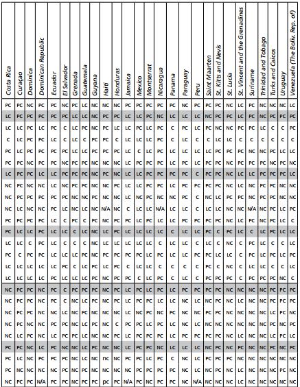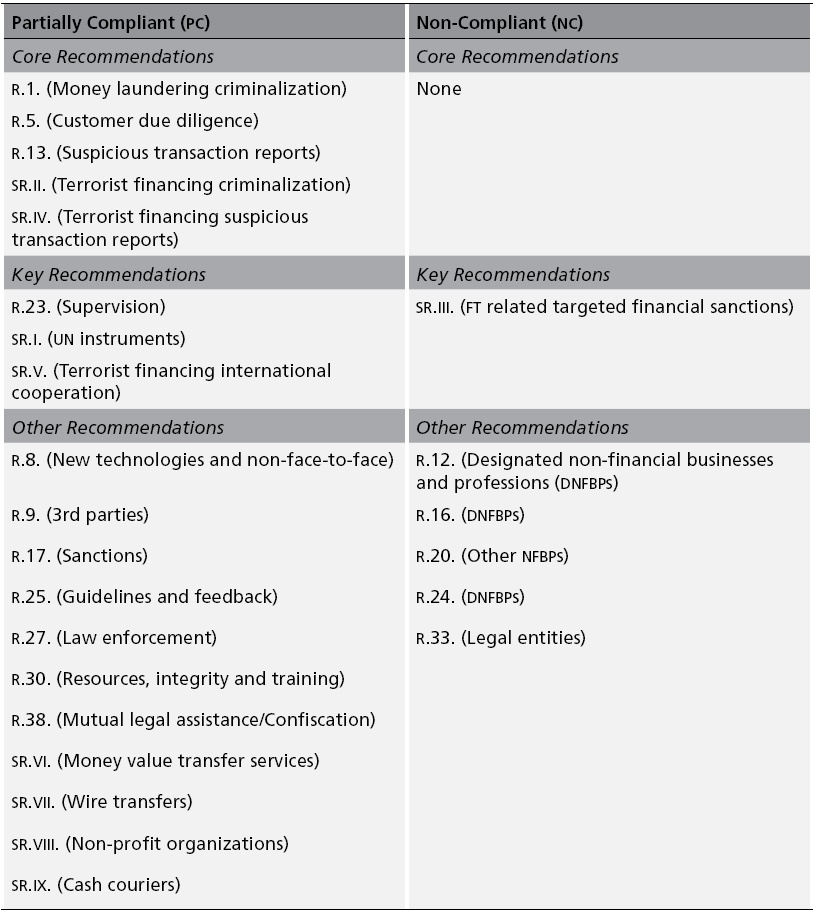 In order to fortify countries' efforts, particular attention should be applied to their compliance rates with Core and Key Recommendations. In Latin America and the Caribbean, nine countries were rated Non-Compliant wit all six Core Recommendations, among them: Antigua and Barbuda, Argentina, Belize, Dominican Republic, Guyana, St. Lucia, Suriname and Trinidad and Tobago and Turks and Caicos. In contrast only Panama and Peru were rated Complaint and/ or Largely Compliant with all six Core Recommendations. The real test for many countries will be in their upcoming fourth Round Mutual Evaluations, which will stress not only the existence of national laws and regulations, but also their application and effectiveness. That is to say, the majority of countries in the region face shortcomings in compliance with Core FATF regulations.