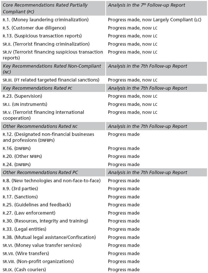 Mexico's first follow-up report to the FATF was issued in October 2010, with the second and third issued in October 2012, and 2013, respectively. The Fourth Follow-up Report, issued in February 2013, illustrated concrete progress in some areas of compliance, but the country was deemed to have shown insufficient progress with regard to some Key Recommendations. At this phase, Mexico entered into a process of Targeted Enhanced Follow-up. Subsequent Follow-up Reports were issued in June 2013 (Fifth Follow-up Report) and October 2013 (Sixth Follow-up Report). In February 2014, Mexico submitted its 7th Follow-up Report to the FATF, as well as its application for removal from the Follow-Up procedure, having identified sufficient progress in addressing the gaps in national compliance, particularly with respect to the Core and Key Recommendations that had been rated Partially Compliant in the third Round Mutual Evaluation (Chart 7).