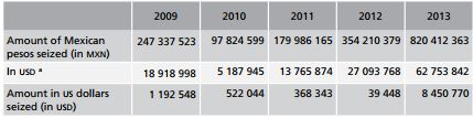 As Chart 8 illustrates, the amount of money seized in recent years in money laundering cases in Mexico has increased rapidly, both in terms of national currency seizures and those in foreign dollar transactions. From 2009 to 2013, monetary seizures in Mexican pesos increased 231%, while seizures in us dollars increased by more than 600% as a result of heightened efforts to monitor, detect and capture flows of illicit money.