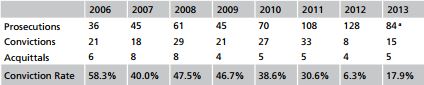 At the Federal level, the number of prosecutions for money laundering cases have also increased, indicating the country's commitment to investigation, and the improved coordination of activities throughout the banking and judicial system. This also reflects increased cooperation with law enforcement agencies and FIUS. Despite the sustained increase in the prosecution rate in Mexico over the last eight years, the conviction rate overall has tapered (Chart 9). From 2006 to 2013, in just over seven years, the number of prosecutions increased by 133%, though the conviction rate dropped from nearly 60% to less than 20% over this same time period.