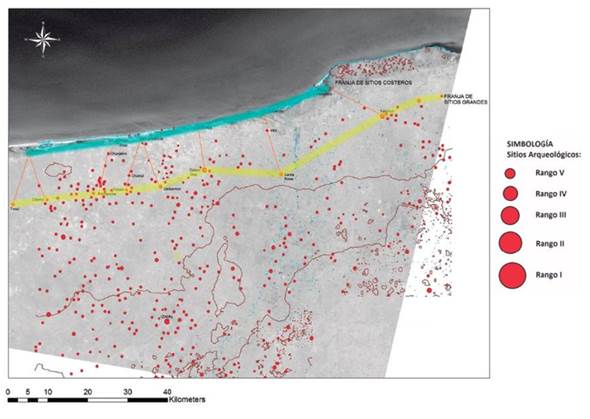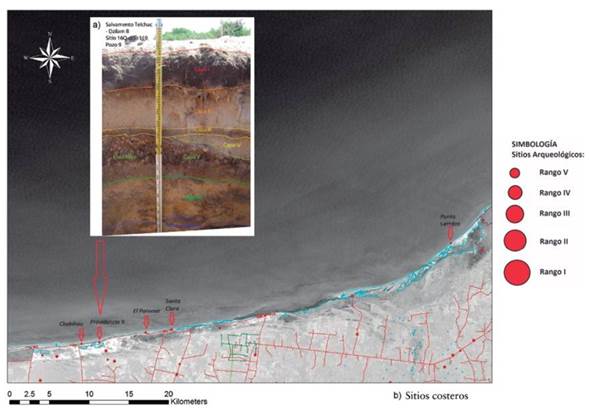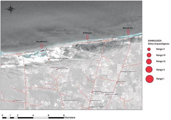 Los sitios costeros conocidos en el área de estudio son Chabihau, en el lado oeste, afectado por la construcción de casas de playa; Providencia II, que ha sido víctima de saqueos pero también objeto de excavaciones controladas; El Porvenir, excavado mediante técnicas arqueológicas; Santa Clara, igualmente bajo una población moderna y Punta Cerritos, en una zona deshabitada en el extremo oriental (Mapa 8b) (Burgos et al., 2011; Covarrubias, 2010, 2010; Velázquez, 1979).