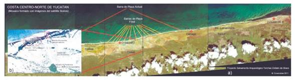 Entre los primeros estudios arqueológicos en la zona costera del norte de Yucatán destacan los recorridos y circunnavegación de Jack Eaton, quien logró registrar en esta área una serie de sitios, algunos con núcleos de arquitectura monumental, ubicados en islotes artificiales dentro de la ciénaga, donde los mayas aprovecharon barras de playas fósiles para su edificación. Sugirió que los sitios mayores en estos islotes debían ser más tempranos que los concheros de la playa actual, pues pensaba que esta última se había formado alrededor del año 1000 d.C. (Eaton y Ball, 1978: 1). Investigaciones posteriores han desechado tal hipótesis (Velázquez, 1979; Sierra, 2004; Burgos et al., 2011); sin embargo, el estudio mencionado fue pionero en el sentido de haber señalado las relaciones estrechas entre la información geomorfológica y ambiental con los datos arqueológicos.