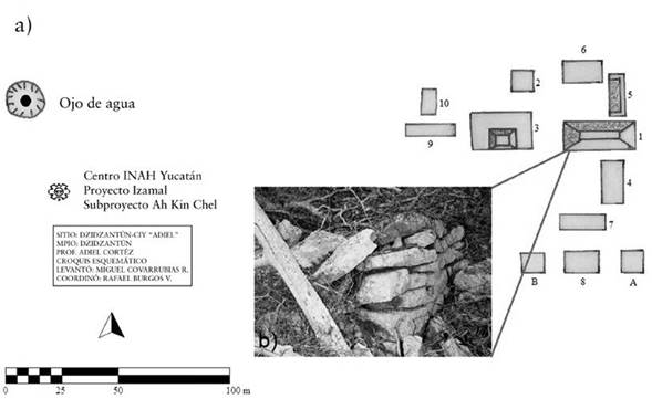 Lo anterior se supo hasta que se intensificaron los recorridos en la zona al suroeste de Dzilam de Bravo, donde se hallaron varios cientos de pequeñas estructuras que se comentarán más adelante. El sitio de Santa Úrsula, al sur de Providencia, es un caserío sencillo, compuesto por poco más de una decena de basamentos, algunos rectangulares y otros de planta circular, hechos con hiladas sencillas de piedras amorfas y sin restos de superestructuras, dispuestos sin un orden aparente, simplemente agrupados sin delimitar espacios públicos. La excepción en cuanto al tipo de asentamientos que se encuentran en el tzekel es Adiel, un sitio ubicado a 860 m al este de Santa Úrsula, que posee un pequeño núcleo formado por dos plazas adyacentes (Mapa 11a), encabezadas por una estructura de 25 m de largo de este a oeste por 12 m de ancho de norte a sur y cuatro metros de altura, con dos cuerpos superpuestos de mampostería burda muy similar a la de sitios como Providencia y Petén Xnuc (Mapa 11b).
