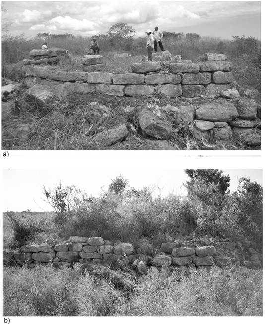 Volviendo a la región de Dzilam de Bravo, el basamento de mayor altura detectada en todo el recorrido alcanza apenas un metro. Es interesante notar que en el área cercana a la costa la mayoría de las estructuras poseen basamentos cuadrangulares o rectangulares y cimientos circulares. A veces sólo está el cimiento directamente sobre el suelo (Figura 1a), mientras que conforme se avanza al sur aparecen estructuras de mayores dimensiones y complejidad (Figura 1b). Desafortunadamente no se hallaron materiales cerámicos en superficie que permitan hacer un fechamiento tentativo de los vestigios, por lo que se tendrá que esperar la etapa de excavaciones. A pesar de lo anterior, por la experiencia obtenida de los salvamentos en la carretera costera y en el camino de San Francisco a Mina de Oro, es posible que la ocupación prehispánica de las estructuras en el proyectado parque eólico abarque también desde el Preclásico Superior hasta el Posclásico Tardío.