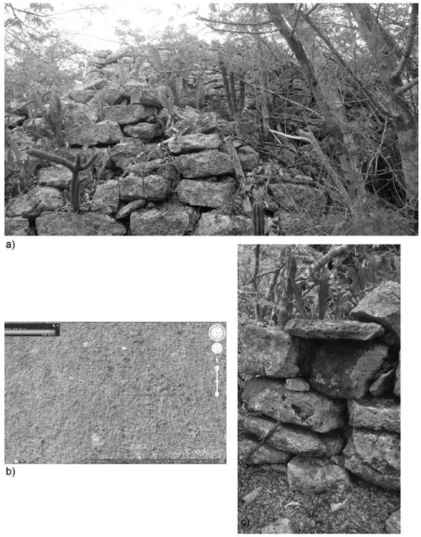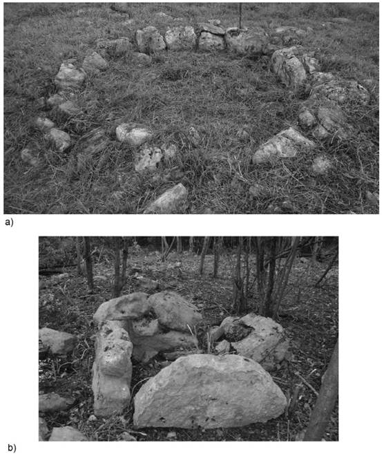 Figura 1 Estructura domestica de planta circular en la zona norte del Parque Eólico de Dzilam de Bravo. b) Altar megalítico sobre plataforma habitacional en la zona sur del Parque Eólico de Dzilam de Bravo.