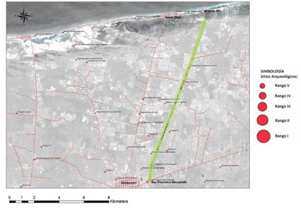 En dicha vía, con un trazo general de norte a sur y 14.5 km de largo, se relacionaron a éste 11 sitios arqueológicos, de los cuales sólo cuatro eran previamente conocidos y los siete restantes se descubrieron durante el desarrollo de este proyecto. Se excavaron aproximadamente 100 estructuras de las que se obtuvo en casi todas una secuencia cerámica continua entre el Preclásico Medio y el Postclásico Tardío, con mayor variedad de tipos cerámicos en el Clásico Tardío, así como una colección importante de lítica y una gran cantidad de concha, la mayoría de deshechos alimenticios, indicando la estrecha relación que los habitantes de la zona tenían con el mar. También se hallaron pruebas de que estas comunidades participaban en el comercio a larga distancia, ya que se encontraron obsidiana, jade y cerámicas importadas, algunos como ofrendas aisladas y otros asociados a entierros. Los asentamientos explorados son todos de carácter doméstico, solamente uno de ellos tuvo una estructura que podría considerarse pública, sin sobrepasar los tres metros de altura. Estas estructuras habitacionales corresponden al tipo arquitectónico megalítico. Aquellas ubicadas un poco lejos de la citada vía estaban muy bien conservadas porque no fueron objeto de saqueos. La densidad de los asentamientos y la calidad constructiva de las estructuras aumentó conforme se avanzaba hacia el sur (Burgos et al., 2007b), (Mapa 2).