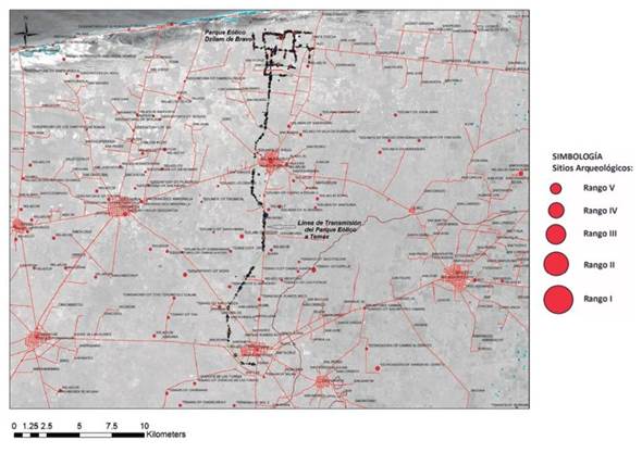 El tercer proyecto de interés para el análisis del paisaje costero fue la prospección del terreno donde se pretende construir un parque eólico para generar electricidad en el punto conocido como El Tajo (Burgos et al., 2014a). Esta es la primera fase de un proyecto de salvamento arqueológico que aún no concluye. Los recorridos se hicieron en dos etapas. En la primera se recorrieron aproximadamente 22 km de brechas en el citado parque, que en total cubre una superficie de 1 500 ha en una zona muy cercana a la costa. La segunda etapa consistió en el recorrido del trazo de una línea de transmisión de 27 km de largo entre los terrenos que serán ocupados por el parque y el pueblo de Temax (Burgos et al ., 2014b). El búfer en ambos casos fue de 100 m de ancho para todas las brechas (Mapa 4).