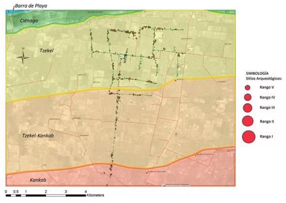 Debido a lo anterior, los asentamientos que se encuentran en esta franja, de unos cuatro kilómetros de ancho, conocida en maya como kankab-tzekel , por la combinación de áreas con suelos y afloramientos de caliza, tienden a ser mayores y están mejor organizados, con espacios públicos, pero por lo general siguen siendo de carácter doméstico.