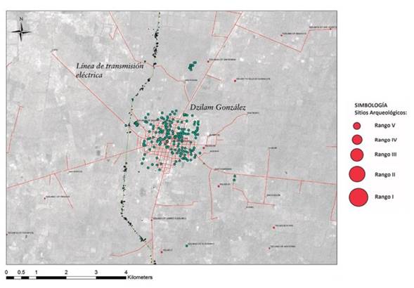 El estudio de este trazo es de gran interés por el hecho de que atraviesa tres de los cinco tipos de ambiente o geosistemas que se encuentran en la región y permite identificar las diferencias que se presentan en los asentamientos ubicados en cada uno de éstos. Asimismo permite diferenciar entre asentamientos rurales y urbanos, ya que la línea pasa por la periferia oriental de la ciudad de Dzilam González, rodeándola. El trazo inicia en el tzekel , una franja de terreno pedregoso de aproximadamente cuatro kilómetros de ancho de norte a sur, desde la orilla de la ciénaga, donde colinda con tierra firme, hasta la última brecha del parque eólico, donde comienza a haber presencia somera de suelos lateríticos, localmente llamados kankab . A partir de esta latitud, siguiendo de norte a sur, estos terrenos conocidos como tzekel-kankab continúan por unos cuatro kilómetros y medio formando una segunda franja. Entre más al sur aumenta la cantidad de suelo y proliferan los asentamientos de dimensiones mayores (Mapa 6).