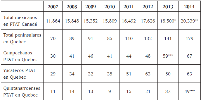 Abstract: This article reports the results of a research project undertaken with temporal agricultural workers in Quebec, Canada, and in the municipalities of Maní, Mama and Dzidzantún in the state of Yucatán, and El Ramonal in the state of Quintana Roo. In this article, I analyze some of the experiences of migrants from the Yucatan peninsula who participated in the Program for Agricultural Temporal Workers in Quebec, Canada (PTAT) during 2012. I undertake an interactional analysis between the cultures of origin and of destination, with an emphasis on the strategies that workers use for their migration process. This is done with the intent of transcending the dichotomous model that focuses on the receptive society and the subsequent affectations of the autochthonous society. This exploratory study included quantitative and qualitative techniques, like ethnographic observation and semistructured interviews, both in Canada and Mexico.