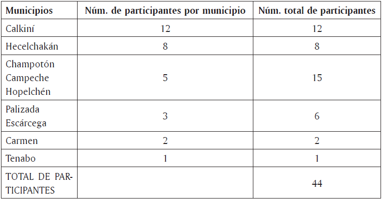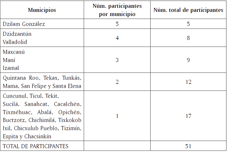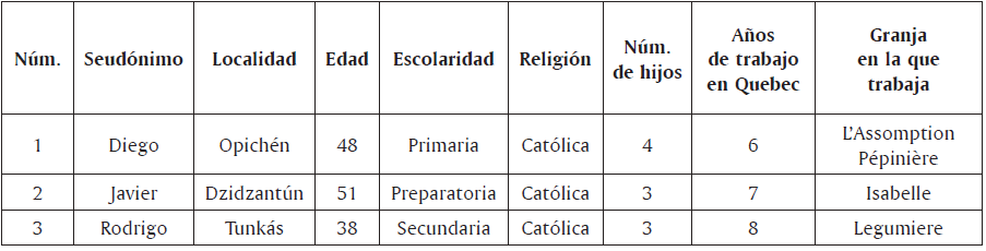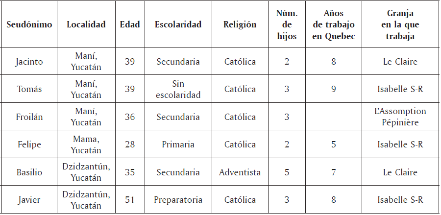 En cuanto al PTAT en Quebec, se puede apreciar (Tabla 1) la distribución de campechanos, yucatecos y quintanarroenses que laboraron entre 2007 y 2014 en esa provincia. Los municipios que más aportaron mano de obra en el estado de Campeche fueron Calkiní, Hecelchakán, Champotón, Hopelchén y Campeche (Tabla 2). Los yucatecos eran originarios de 29 municipios, entre los que destacan Dzilam González, Dzidzantún, Valladolid, Maxcanú, Maní, Izamal y Mama (Tabla 3). Hasta 2011, los de Quintana Roo eran todos nacidos (o avecindados)[4] en Othón P. Blanco (Tabla 4). Entre quienes entrevisté se encuentran ocho varones (Tablas 5 y 6), y en el grupo de informantes clave están cuatro mujeres, dos son trabajadoras, y dos, esposas de migrantes (Tabla 7).