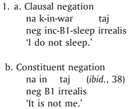 The initial part of the circumfix is optional in the adult language, and is frequently omitted in speech to children. The final part of the K’iche’ circumfix appears as ‘taj’ in clause final contexts and as ‘ta’ in non-final contexts. We label the final part of the K’iche’ circumfix an irrealis marker since ‘ta(j)’ also marks irrealis in optative and conditional contexts. Romero (2012) proposes analyzing the post-predicate clitic ta(j) as the sole negation marker in K’iche’ as the initial negator na is frequently omitted.