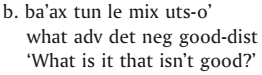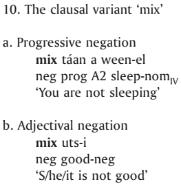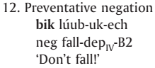 Yucatec also has other forms of clausal negation. The form ‘mix’ is primarily used to negate nominal, pronominal and adjectival predicates with translations of “no” or “neither” (Bolles & Bolles, 2014). The eastern dialect of Yucatec studied here uses the form ‘mix’ (10) as well as ‘ma’’ for clausal negation. All variants of Yucatec use the form ‘min’ for existential negation (11). Yucatec also uses the form ‘bik’ in preventative contexts (12). The trapping particle -i’ is not used with either ‘min’ or ‘bik’.