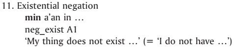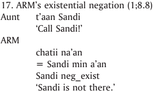 In negative existential contexts (17) ARM uses the form ‘na’an’ (= min + yan), in comparison with the affirmative contexts where the child uses ‘yan’. There is no evidence that he extended this form to discourse contexts of negation or that he extended the form ‘ma’’ to existential contexts.