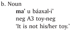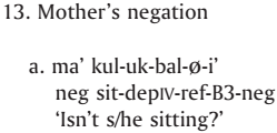 The example sentence in (8) shows that discourse negation can combine with and precede clausal negation in a sentence. This example also illustrates the use of the ‘trapping’ particle -i’ at the end of the clause. This particle occurs at the end of the clause rather than following the verb complex as in K’iche’. Durbin & Ojeda (1978: 60) state that the trapping particle marks the end of a constituent that is focused by a question, locative, demonstrative or negation. Its use is optional.