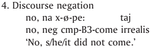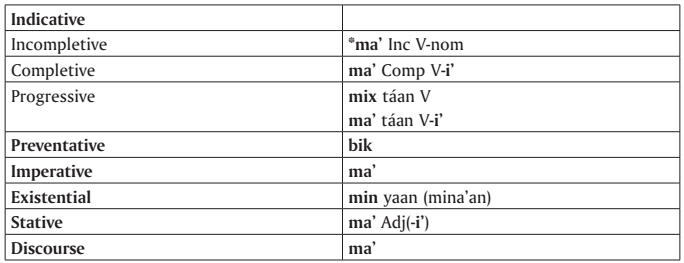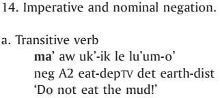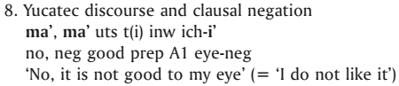 Yucatec, like K’iche’, has a fairly simple form of negation as shown in Table 3. Yucatec uses the form ‘ma’’ to mark both discourse and clausal negation3. Unlike K’iche’, clausal negation has an external position preceding the predicate in Yucatec.