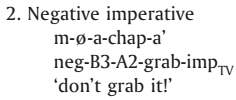 K’iche’ speakers have the option of substituting the negative aspect prefix m- for the circumfix in imperatives (2). K’iche’ marks aspect in non-negative imperatives with k-, ch- or ø- (Mondloch, 1981: 86-87). The negative imperative prefix is used in place of these aspect prefixes. The circumfix may also be used to negate imperatives.