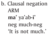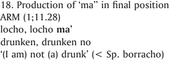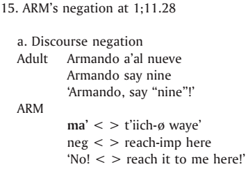ARM’s general frequency of negative production is similar to that of his caretakers’. We found three differences with his caretakers’ forms of negation. In contrast to his caretakers ARM used ‘ma’’ more frequently as discourse negation (43%) than as clausal negation (11%). ARM also produced the trapping particle -i without ‘ma’’. Finally, ARM did not produce the preventative negation form ‘bik’. Examples of ARM’s use of ‘ma’’ in both discourse and clausal contexts are shown in (15). Note the use of the negative particle in the example (15b).