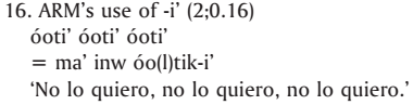 ARM produced the verbal root ‘óot’ with the -i’ suffix in the same session with the meaning of ‘I don’t want (it)’ (16). This is the only case where we could assume that Yucatec children follow the K’iche’ preference for post-predicate negation marking.