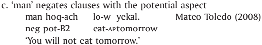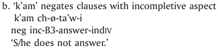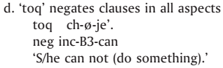 The examples in (18) demonstrate the interaction between negation and aspect in Q’anjob’al. The negative marker ‘maj’ is restricted to verbs in the completive aspect (18a). Like the K’iche’ negative imperative prefix m-, ‘maj’ appears in place of the completive aspect marker ‘max’. The use of ‘maj’ also requires a change to the dependent status suffix -oq. The negative marker ‘k’am’ is used with verbs in the incompletive aspect (18b). It selects for a fully inflected verb complement that has the incompletive aspectual prefix ch- as well as the indicative status suffix -i. Q’anjob’al uses the marker ‘man’ with verbs in the potential aspect (18c). ‘Man’ also negates imperative verbs. In addition, Q’anjob’al uses the negative marker ‘toq’ for verbs in all three indicative aspects (18d).