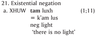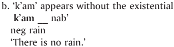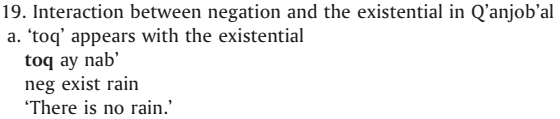 The negative markers ‘toq’ and ‘k’am’ display an interesting interaction with the existential in Q’anjob’al (19). ‘Toq’ is used with the existential (19a) while ‘k’am’ is used in place of the existential (19b). The sentences have very similar meanings.