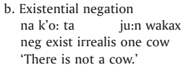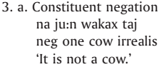 K’iche’ distinguishes cases of existential negation from constituent negation (3). If children use constituent negation in existential contexts, we would expect K’iche’ children to use the circumfix to negate the constituent. In this case, the irrealis marker will follow the constituent (3a). If the children negate the existential verb rather than the constituent, the irrealis marker will follow the existential and precede the constituent (3b).
