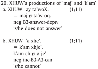 The initial forms of XHUW’s negation markers are very similar. The examples in (20) show her initial productions for ‘maj’ and ‘k’am’ in contexts of clausal negation. Both words were reduced to /a/ with a following glide or a preceding glottal stop. The transcribers relied upon the discourse context to interpret XHUW’s intended target form. At this age, XHUW regularly replaced /k’/ with a glottal stop. The omission of initial /m/ was less regular.